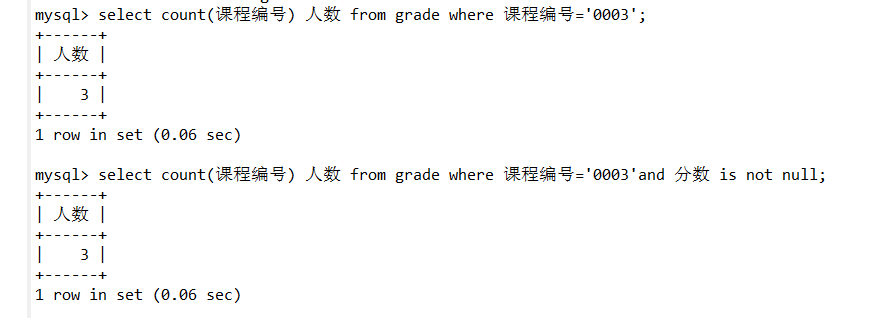 (3)在grade表中查询选修课程编号为0003的人数和该课程有成绩的人数。