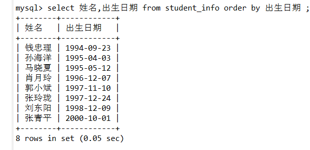 (4)查询student_info的姓名和出生日期,查询结果按出生日期从大到小排序。