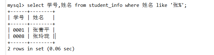 select 学号,姓名 from student_info where 姓名 like '张%';