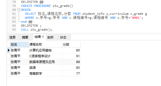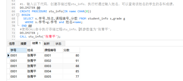1.输入以下代码,创建存储过程stu_info,执行时通过输入姓名,可以查询该姓名的学生的各科成绩。