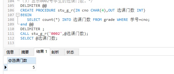 CREATE PROCEDURE stu_g_r(IN cno CHAR(4),OUT 选课门数 INT)