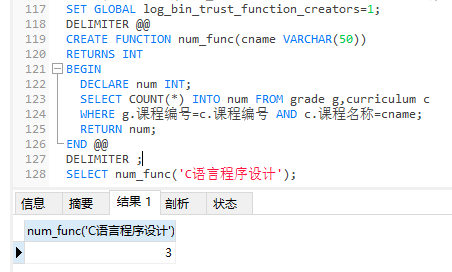(2)执行存储函数num_func,查看“C语言程序设计”选课人数