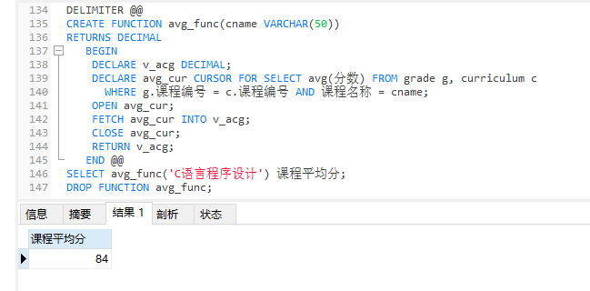 SELECT avg_func('C语言程序设计') 课程平均分;