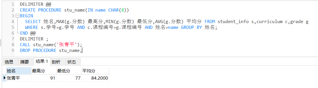 (1)创建存储过程stu_name,当任意输入一个学生的姓名时,查看其课程的最高分、最低分、平均分。