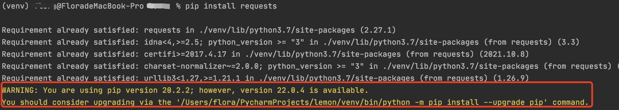You should consider upgrading via the '/Users/flora/PycharmProjects/lemon/venv/bin/python -m pip install --upgrade pip' command.