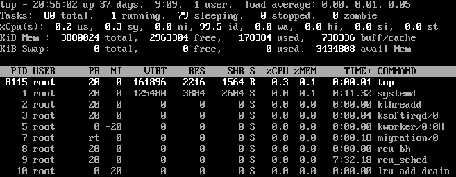 系统当前时间为20:56:02,该云服务器已运行37天,当前共有1个用户登录, 最近1分钟、最近5分钟和最近15分钟的CPU平均负载。