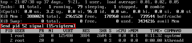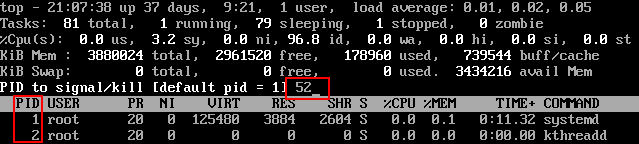 top界面中按k键,输入进程的PID,然后回车确认。进程的PID为top命令回显的第一列数值。例如,要终止PID为52的进程,直接输入“52”后回车。
