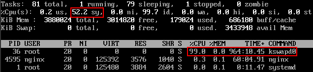 kswapd0进程频繁运行,说明系统可能在进行大量的页面交换操作,这通常与物理内存不足有关。