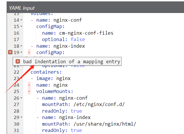 yaml文件内容复制粘贴到文本框,然后单击Validate YAML按钮进行验证如下示范,根据第一列序号的判断提示进行语句更正即可