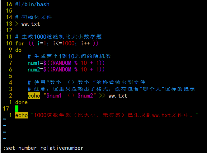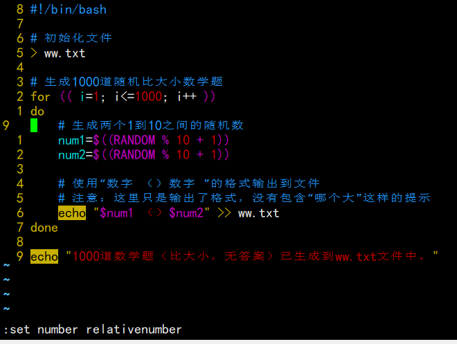 :(冒号)键开始编写命令。这会让 Vim 知道你正在输入一个命令。现在输入:set number relativenumber。