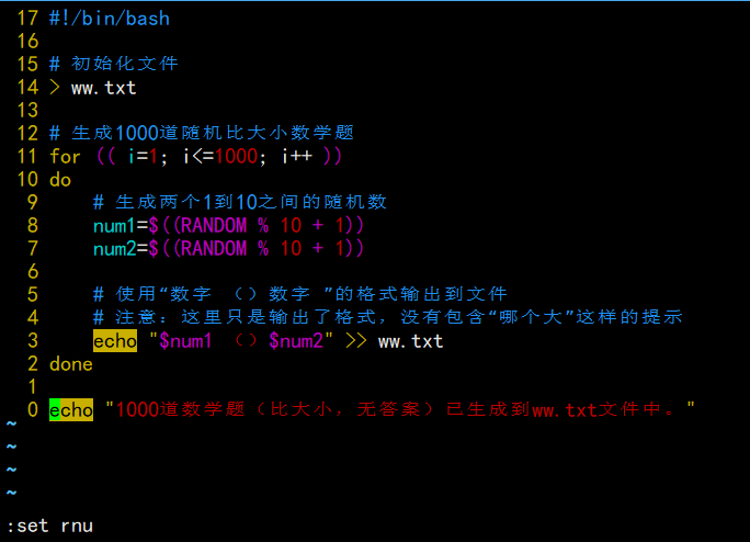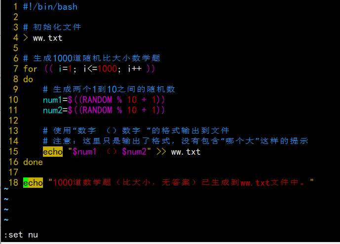 若需关闭行号显示,再按 Esc 键进入命令模式,执行输入:set nonu 即可