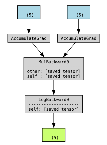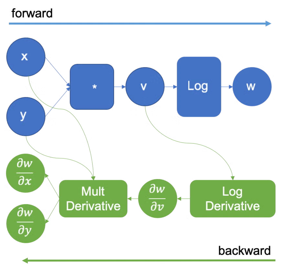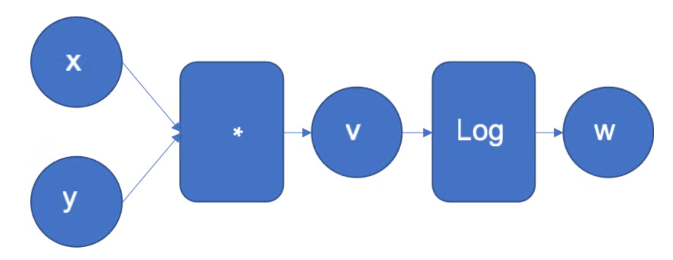 举一个来自Pytorch官方博客的例子,下面的函数代表对输入数据\(x,y\)做数学运算后得到输出结果\(w\),中间经过相乘和对数两个数学运算: