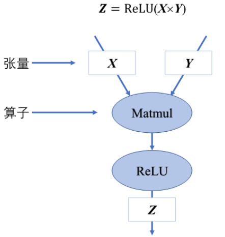 下面这个来自OpenMLSys的例子能更好地反映计算图地概念。它表示了\(Z = ReLU(XY)\)这个计算,其中数据\(X,Y,Z\)都画成了Graph里Edge上的方框,代表它是在边上流动的,而两个数学运算MatMul和ReLU则用了常见的圆圈节点: