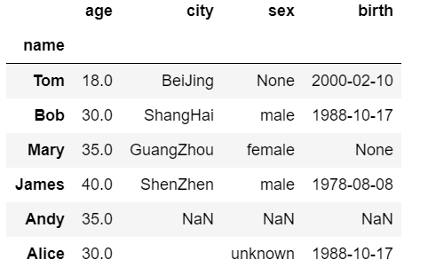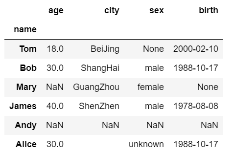 index = pd.Index(data=["Tom", "Bob", "Mary", "James", "Andy", "Alice"], name="name") data = { "age": [18, 30, np.nan, 40, np.nan, 30], "city": ["BeiJing", "ShangHai", "GuangZhou", "ShenZhen", np.nan, " "], "sex": [None, "male", "female", "male", np.nan, "unknown"], "birth": ["2000-02-10", "1988-10-17", None, "1978-08-08", np.nan, "1988-10-17"] } user_info = pd.DataFrame(data=data, index=index) # 将出生日期转为时间格式 user_info["birth"] = pd.to_datetime(user_info.birth) user_info