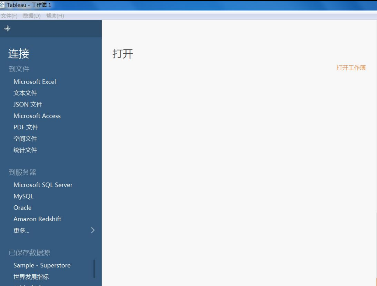 界面的左边指示数据的来源,Tableau 可以连接到本地的Excel 表格,文本,Access 数据库,统计文件等,也可以连接数据库服务器,例如Microsoft SQLServer数据库,MySQL 数据库,Oracle 数据库等。左边最下面显示了已保存的数据源。中间上部分显示最近打开过的工作薄,下部分显示示例工作薄,即Tableau自带的一些工作薄,可以点击更多样本查看更多的数据图。右边显示了探索,每周精选以及 Tableau 一些社区,博客,新闻等等。第一次运行该软件,可以点击某一个示例工作薄,查看该软件数据展示的图示,以及如何简单操作。本次入门实践使用自带的超市工作簿。