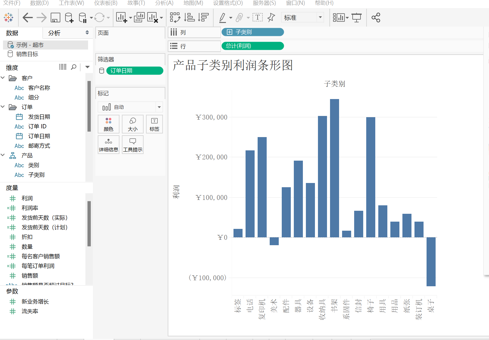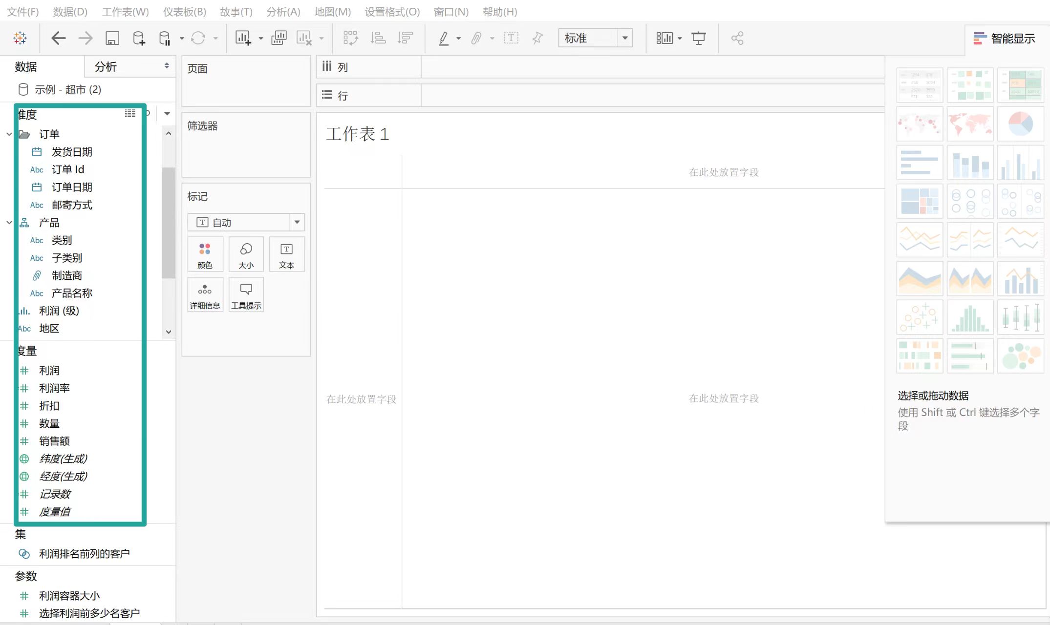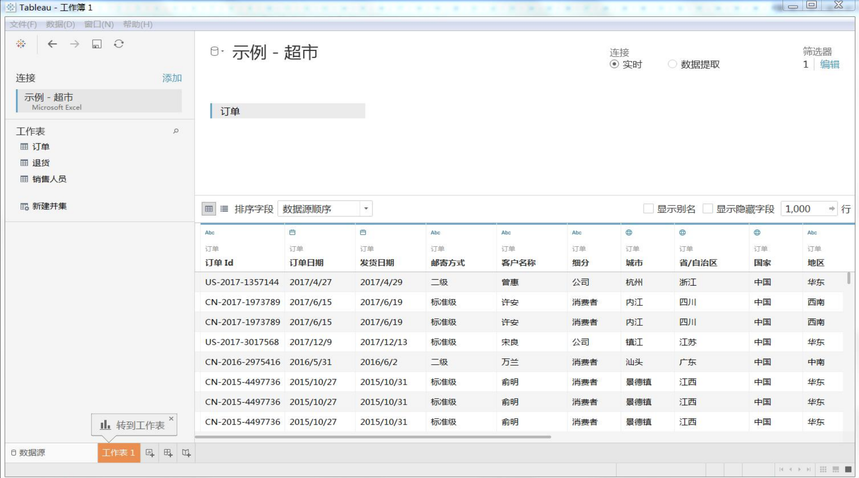 在界面的右下角可以新建一个工作表或者直接用软件默认打开的工作表1。这里打开默认工作表 1,是超市订单中的数据。左侧就是订单这个表格的维度和度量。维度通常是类别字段,例如“产品”和“地区”。具体来说Tableau 中的维度用于设置粒度,即视图中的详细级别。度量通常是指标,即数字数据,例如“销售额”。大多数情况下,维度是离散的,而度量是连续的。