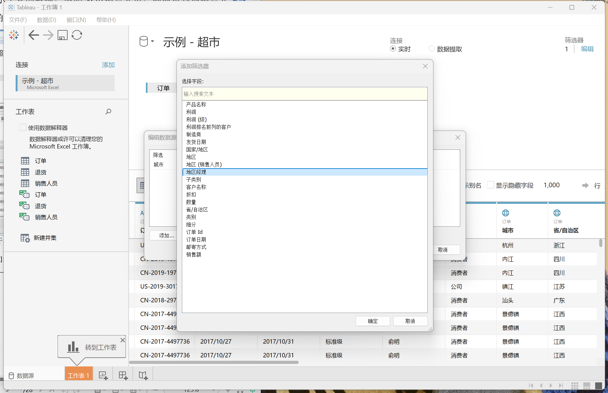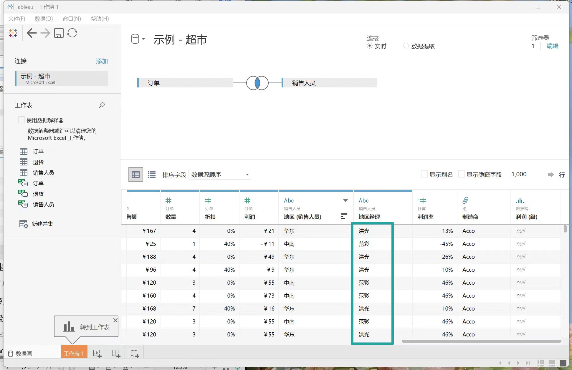 2、点击上图示左侧“已保存数据源”下的“示例-超市”。打开界面后,点击左下角的“数据源”,结果如下。
