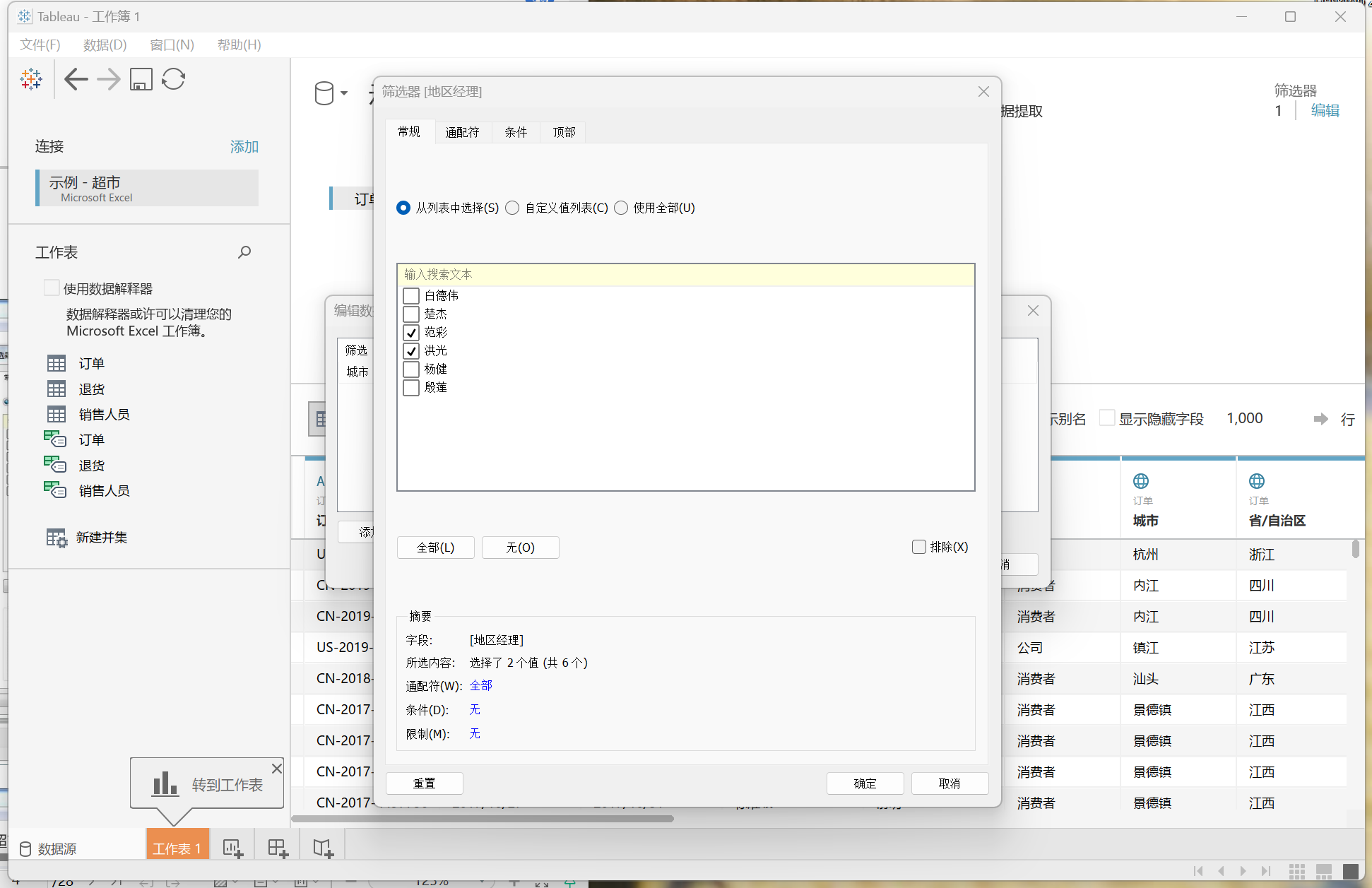 上图中按“地区经理”进行数据筛选。 在“筛选器”中选中范彩和洪光两位地区经理的名字,确定后,筛选结果如下。