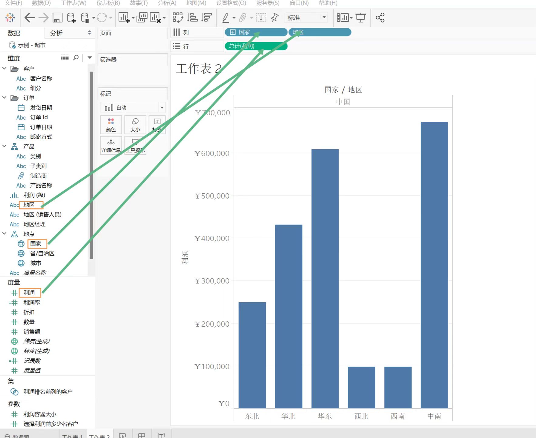 3、制作中国各个地区的利润图表。 将国家和地区维度拖到列,把利润度量拖到行,即可制作出一个简单的条形图。Tableau 最具有特色的功能就是拖放式的操作,只需要把维度以及度量拖到适当的位置,即可制作数据图表。