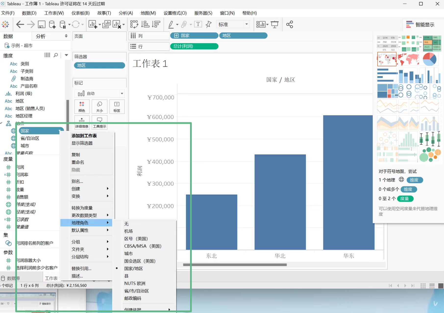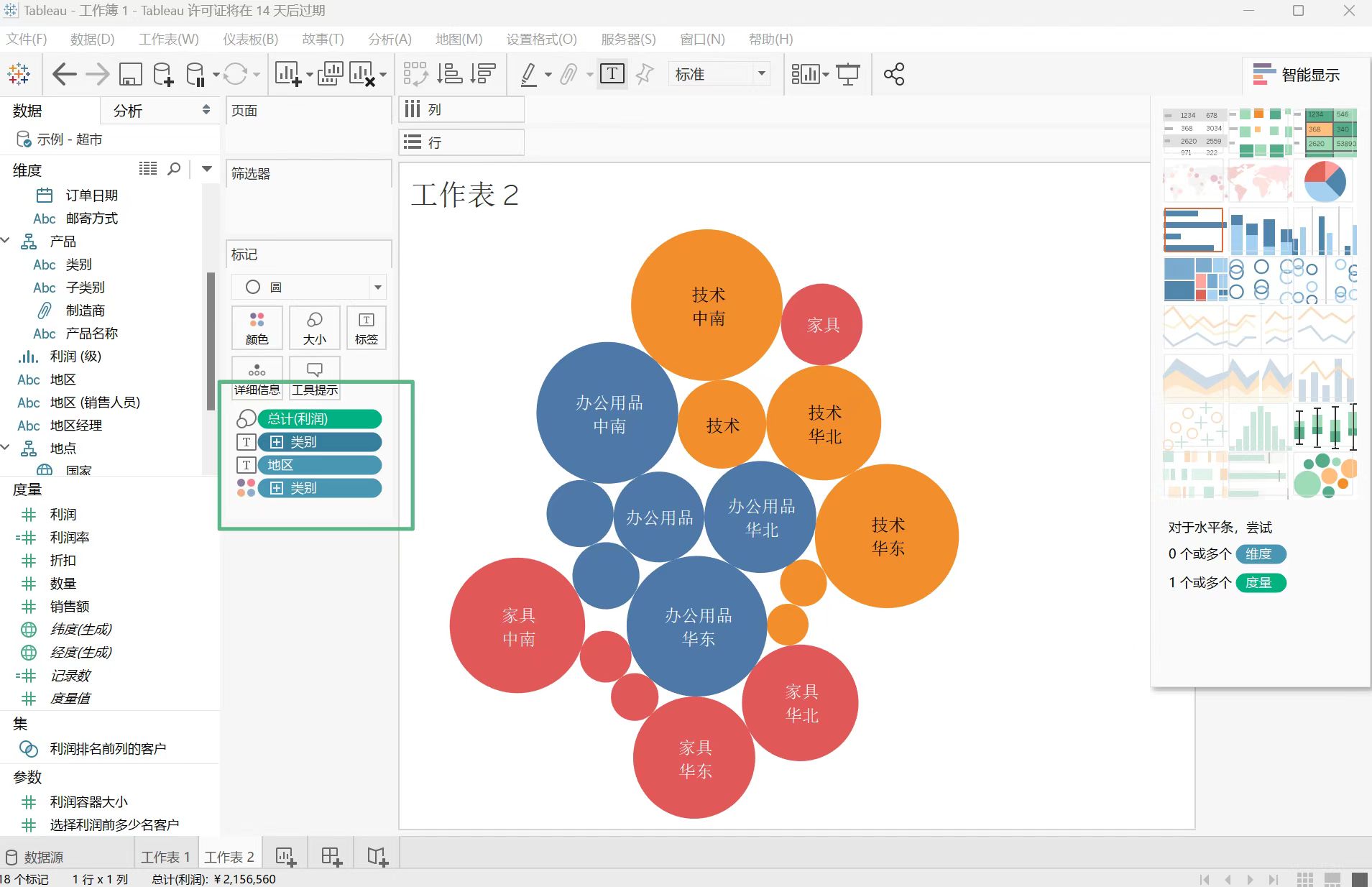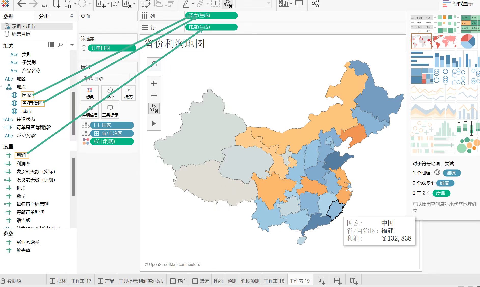 然后,制作中国各个省份利润填充地球图,这里需要将国家和省/自治区维度拖到列,把利润拖到行,再点击“智能显示”里的填充气球图。