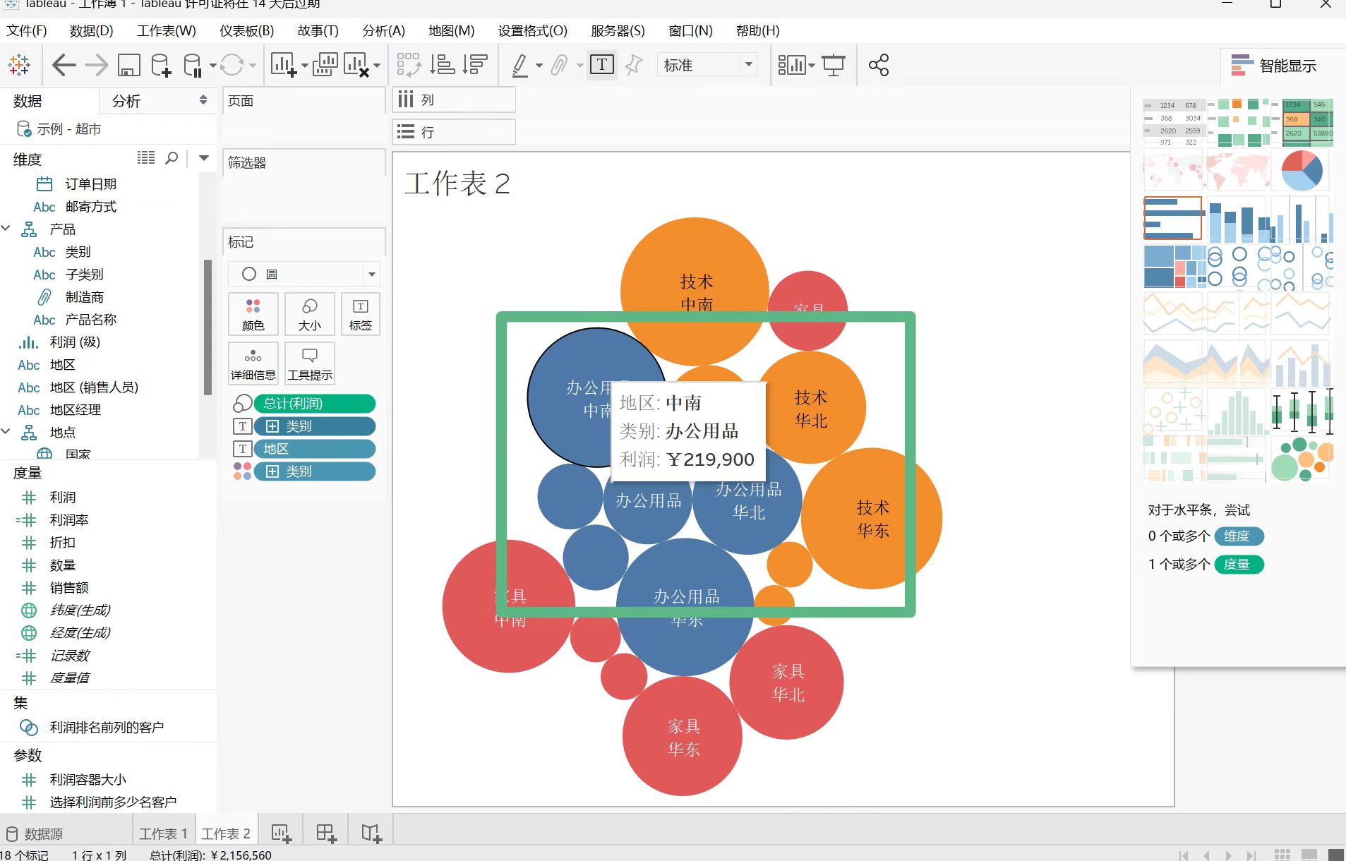 点击右上角的“智能显示”,还可以把同样的数据显示成不同形式的图表。例如,点击填充气泡图,即可制作出漂亮的类别和地区的气泡图。