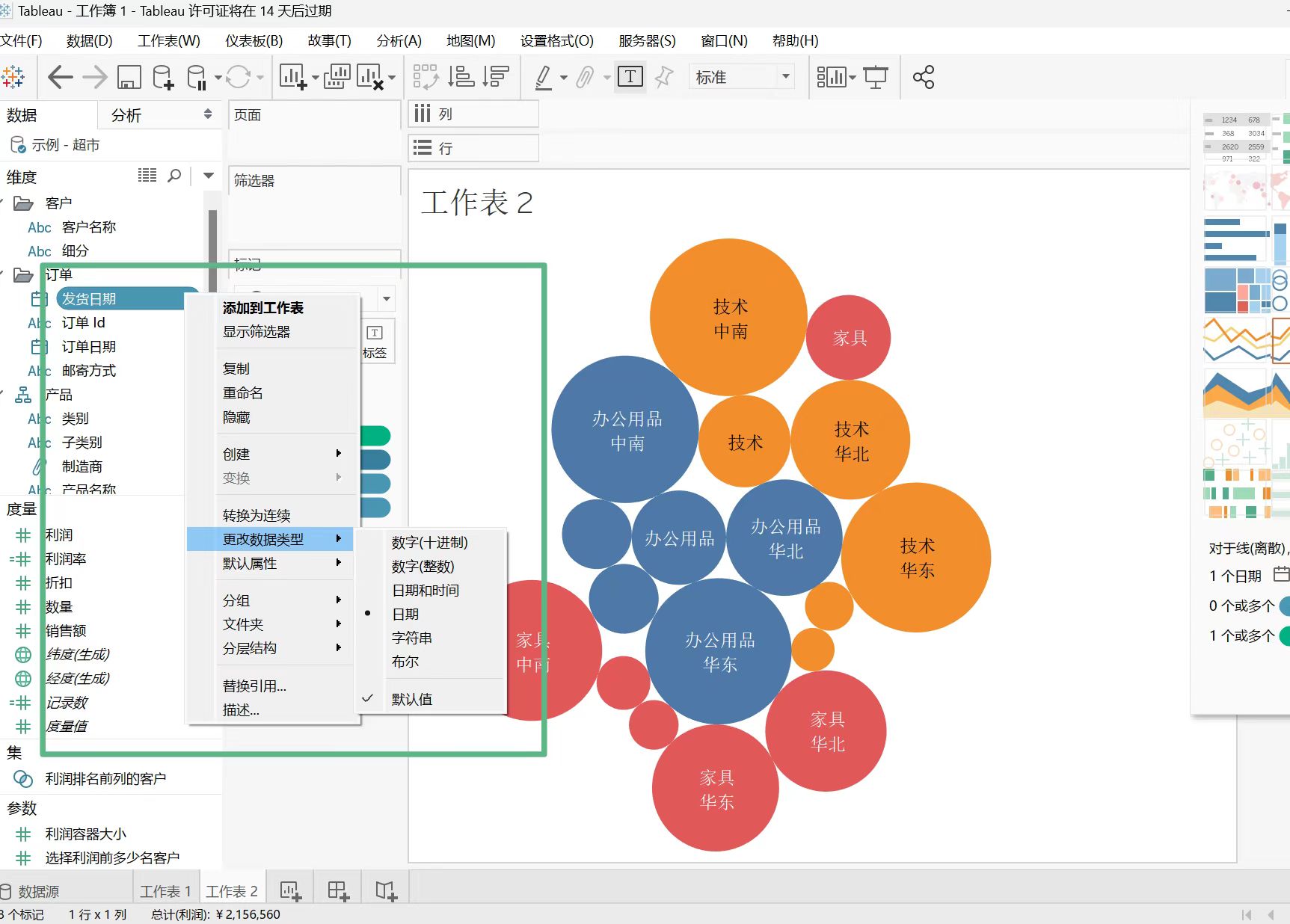 用 Excel 制作填充地球图十分复杂,但是 Tableau 制作填充地球图却十分方便,一键生成。Tableau 将数据分为:数字(十进制),数字(整数),字符串,布尔,日期,日期和时间,还有地理类型(如果数据源中有城市,省份的数据可以分配为地理类型)。选择任意一个字段,单击鼠标右键,在菜单中指向“更改数据类型”即可查看该字段的默认类型,也可更改其数据类型。