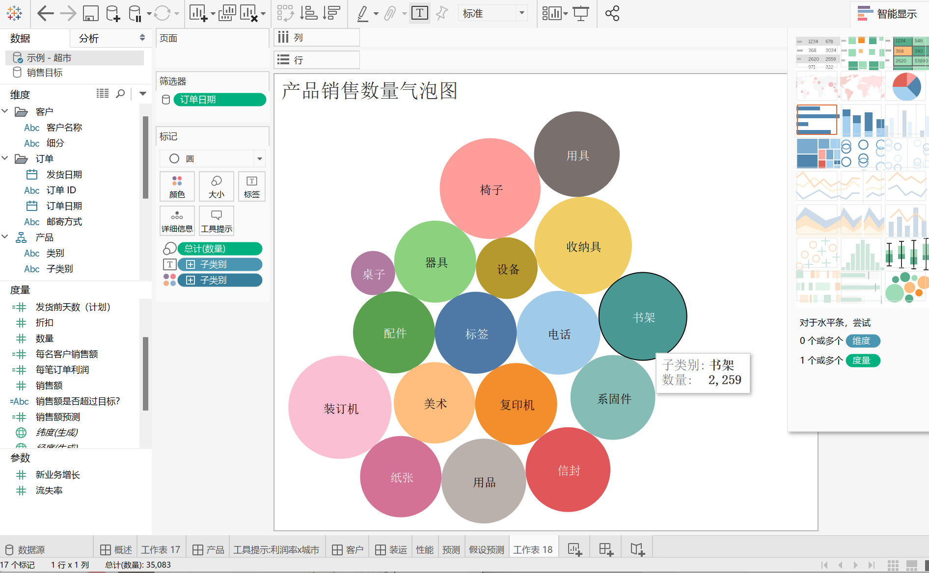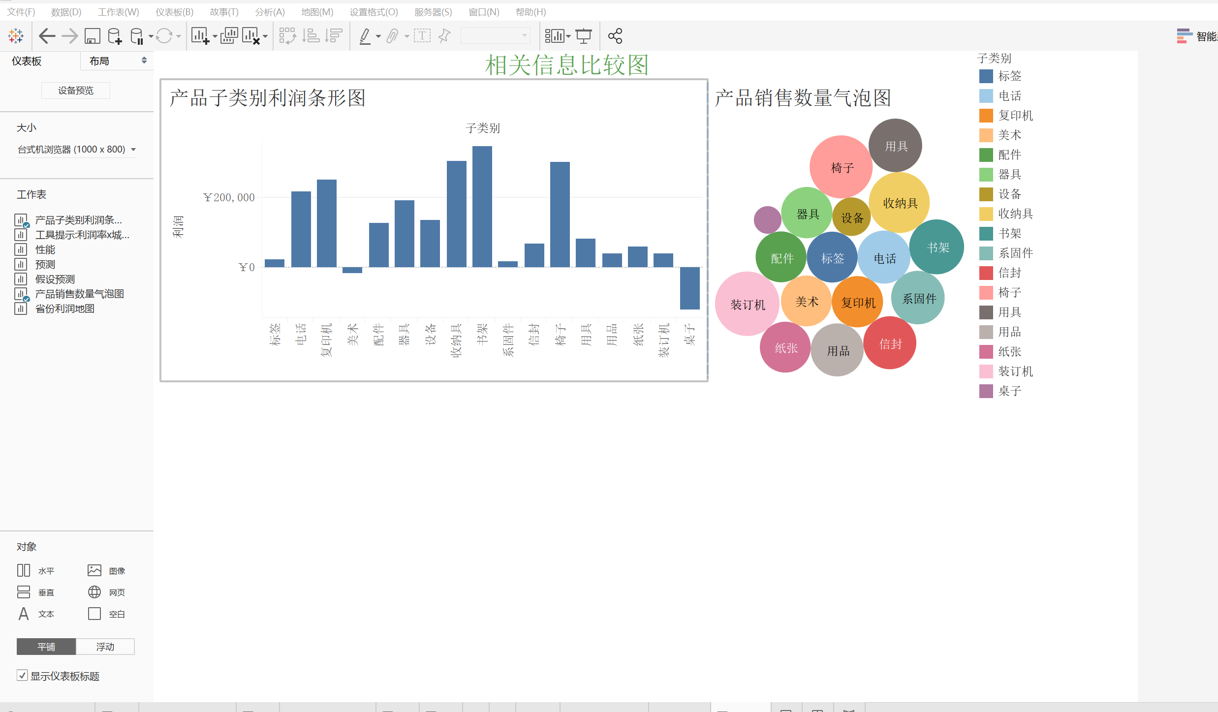 然后,将“产品子类别利润条形图”、“产品销售数量气泡图”工作表拖进这个水平对象里,并排放置。