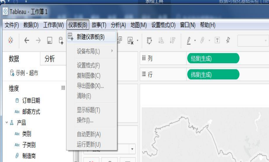 下面开始建立仪表板。在 Tableau 的菜单中选择“仪表板”,选择“新建仪表板”。