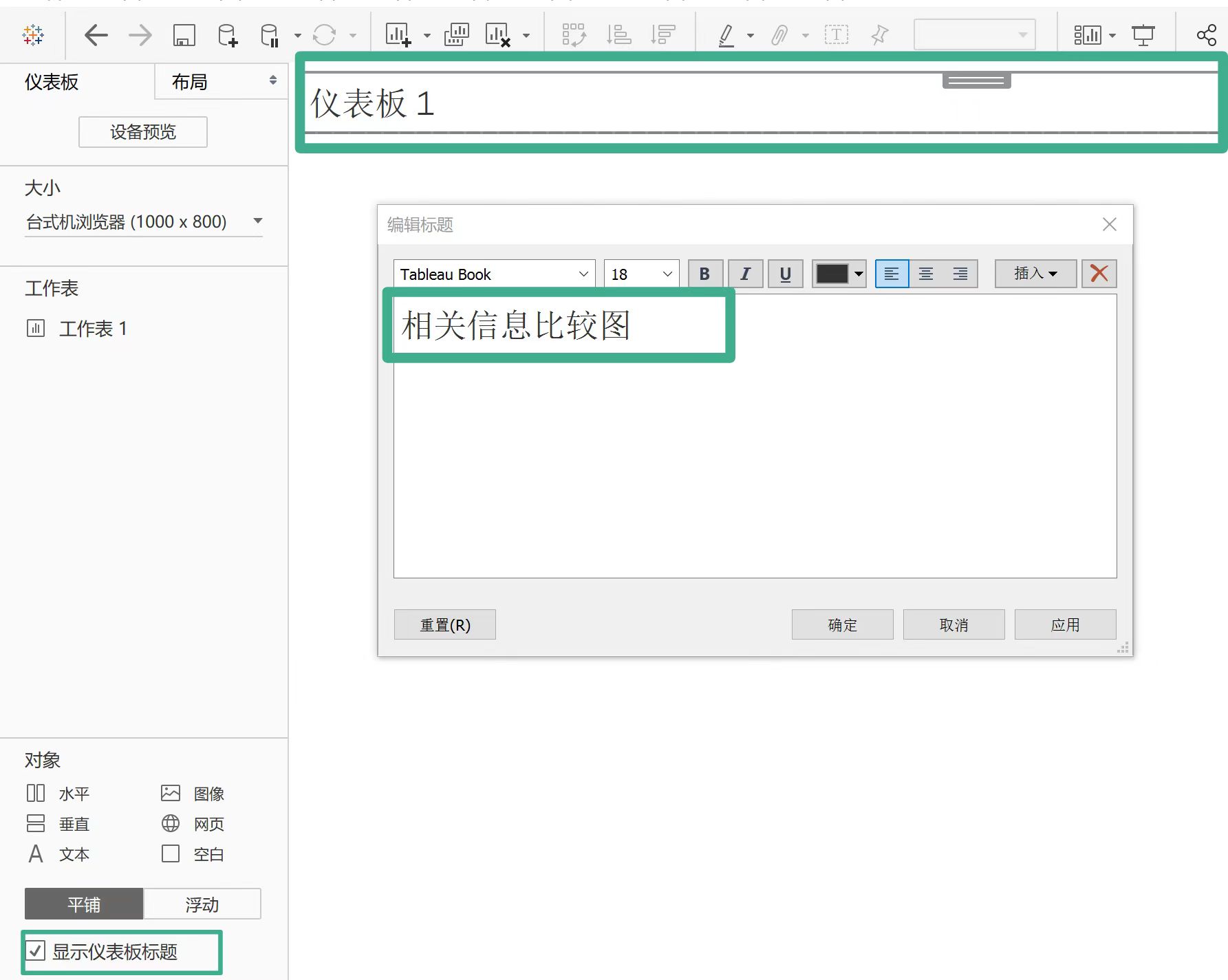 在左下角选中“显示仪表板标题”,然后双击顶端的“仪表板1”,修改标题内容为“相关信息比较图”,可对标题做格式化操作,改变其大小、显示位置和颜色等属性。这是新建仪表板的标题,放在最顶部。
