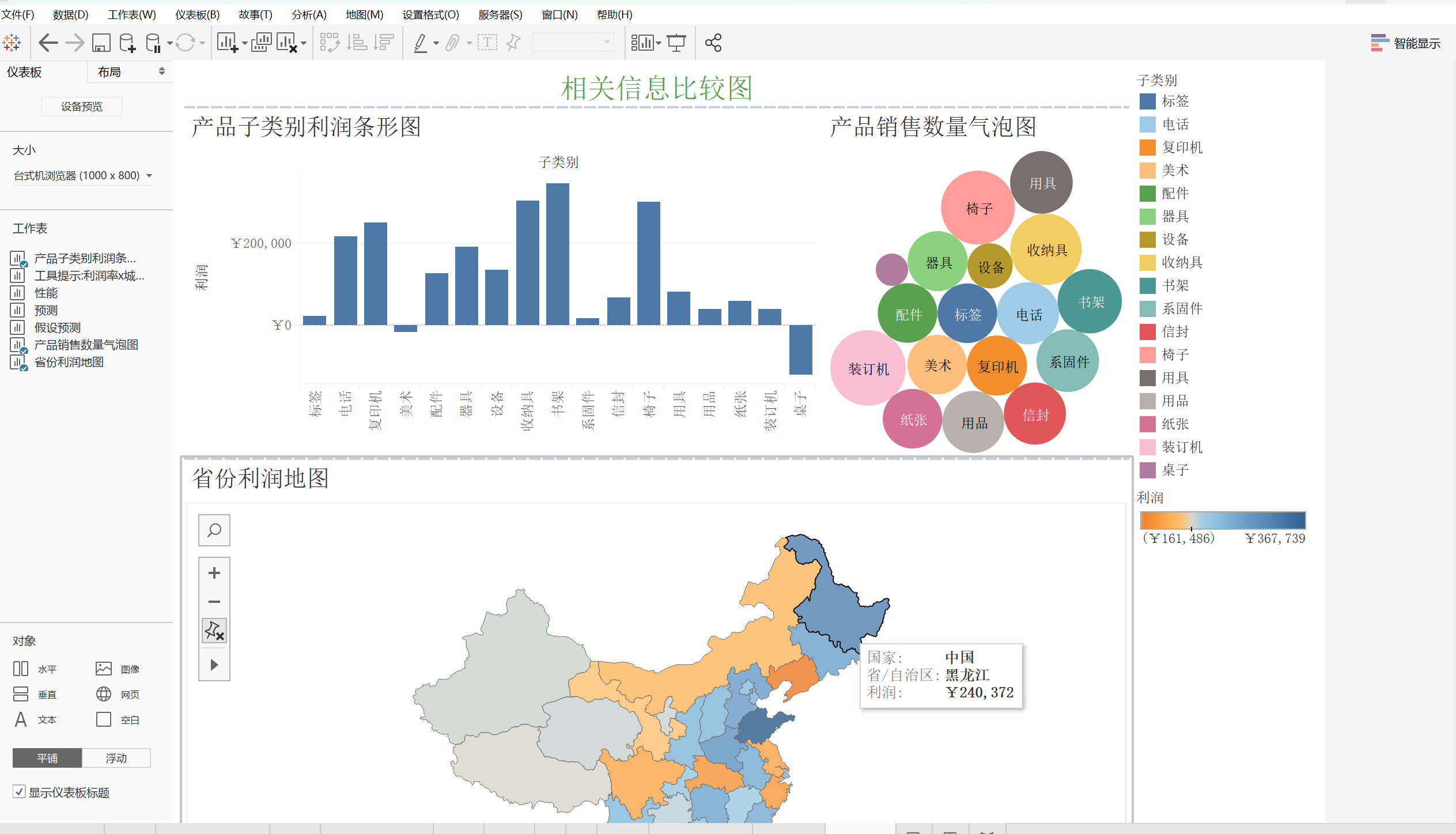 最后再将省份利润工作表拖进水平对象的下部,仪表板制作完成。