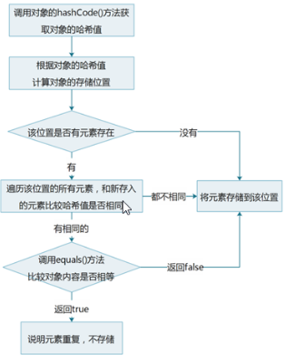 ***HashSet:底层是哈希表,无序,无索引(不能使用普通for),唯一。保证为唯一性的原理如下图: