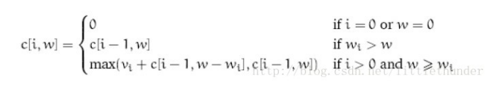 n=5是物品的数量,c=10是书包能承受的重量,w=[2,2,6,5,4]是每一个物品的重量,v=[6,3,5,4,6]是每一个物品的价值,先把递归的定义写出来: