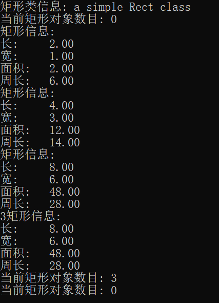 #include <iostream> #include <string> #include <iomanip> using namespace std; class Rect { private: static const string doc; static int size; double length; double width; public: Rect() : length(2.0), width(1.0) { size++; } Rect(double l, double w) : length(l), width(w) { size++; } Rect(const Rect& r) : length(r.length), width(r.width) { size++; } ~Rect() { size--; } static int size_info() { return size; } double len() { return length; } double wide() { return width; } double area() { return length * width; } double circumference() { return 2 * (length + width); } void resize(double times) { length *= times; width *= times; } void resize(double l_times, double w_times) { length *= l_times; width *= w_times; } void output() { cout << "矩形信息: " << endl; cout << fixed << setprecision(2); cout << "长度: " << length << endl; cout << "宽度: " << width << endl; cout << "面积: " << area() << endl; cout << "周长: " << circumference() << endl; } }; const string Rect::doc = "Rect类用于表示矩形"; int Rect::size = 0; void output(const Rect &r) { r.output(); } void test() { cout << "矩形类信息: " << Rect::doc << endl; cout << "当前矩形对象数目: " << Rect::size_info() << endl; Rect r1; output(r1); Rect r2(4, 3); output(r2); Rect r3(r2); r3.resize(2); output(r3); r3.resize(5, 2); output(r3); cout << "当前矩形对象数目: " << Rect::size_info() << endl; } int main() { test(); cout << "当前矩形对象数目: " << Rect::size_info() << endl; }