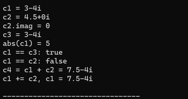 1 #include <iostream> 2 #include <complex> 3 4 // 测试标准库提供的复数类模板complex 5 void test_std_complex() { 6 using namespace std; 7 complex<double> c1{3, 4}, c2{4.5}; 8 const complex<double> c3{c2}; 9 cout << "c1 = " << c1 << endl; 10 cout << "c2 = " << c2 << endl; 11 cout << "c3 = " << c3 << endl; 12 cout << "c3.real = " << c3.real() << ", " << "c3.imag = " << c3.imag() 13 << endl; 14 cout << "c1 + c2 = " << c1 + c2 << endl; 15 cout << "c1 - c2 = " << c1 - c2 << endl; 16 cout << "abs(c1) = " << abs(c1) << endl; // abs()是标准库数学函数,对复数取模 17 cout << boolalpha; // 设置bool型值以true/false方式输出 18 cout << "c1 == c2: " << (c1 == c2) << endl; 19 cout << "c3 == c2: " << (c3 == c2) << endl; 20 complex<double> c4 = 2; 21 cout << "c4 = " << c4 << endl; 22 c4 += c1; 23 cout << "c4 = " << c4 << endl; 24 } 25 26 int main() { 27 test_std_complex(); 28 }