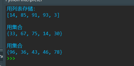 import random print('用列表存储:') lst = [random.randint(0,100) for i in range(5)] print(lst) print('\n用集合') s1 = {random.randint(0,100) for i in range(5)} print(s1) print('\n用集合') s2 = set() while len(s2)<5: s2.add(random.randint(0,100)) print(s2)