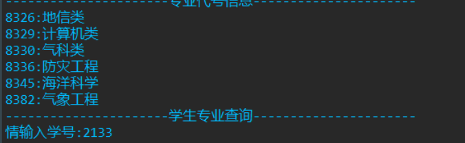 print('专业代号信息'.center(50, '-')) y = {8326: '地信类', 8329: '计算机类', 8330: '气科类', 8336: '防灾工程', 8345: '海洋科学', 8382: '气象工程'} for i in y: print(f'{i}:{y[i]}') print('学生专业查询'.center(50,'-')) while True: x = str(input('情输入学号:')) if x == '#': break elif int(x[4:8]) in y.keys(): print(f'专业是:{y[int(x[4:8])]}') else: print('不在这些专业中...') print('查询结束...')
