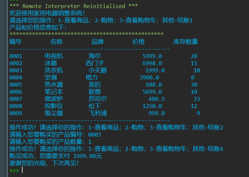 print('欢迎使用家用电器销售系统!') products=[ {'id':'0001','name':'电视机','brand':'海尔','price':5999.00,'count':20}, {'id':'0002','name':'冰箱','brand':'西门子','price':6998.00,'count':15}, {'id':'0003','name':'洗衣机','brand':'小天鹅','price':1999.00,'count':10}, {'id':'0004','name':'空调','brand':'格力','price':3900.00,'count':0}, {'id':'0005','name':'热水器','brand':'格力','price':688.00,'count':30}, {'id':'0006','name':'笔记本','brand':'联想','price':5699.00,'count':10}, {'id':'0007','name':'微波炉','brand':'苏泊尔','price':580.00,'count':33}, {'id':'0008','name':'投影仪','brand':'松下','price':1250.00,'count':12}, {'id':'0009','name':'吸尘器','brand':'飞利浦','price':999.00,'count':9}, ] products_cart = [] option = input('请选择您的操作:1-查看商品;2-购物;3-查看购物车;其他-结账') while option in ['1', '2', '3']: if option == '1': print('产品和价格信息如下:') print(f'{"":*>48s}') print(f'{"编号":10s}{"名称":10s}{"品牌":10s}{"价格":10s}{"库存数量":10s}') print(f'{"":->50s}') for i in range(len(products)): print('{:10}'.format(products[i]['id']),'{:10}'.format(products[i]['name']),'{:10}'.format(products[i]['brand']),'{:10}'.format(products[i]['price'])) print(f'{"":->50s}') elif option == '2': product_id = input('请输入您要购买的商品编号:') while product_id not in [item['id'] for item in products]: product_id = input('编号不存在,请重新输入您要购买的产品编号:') count = int(input('请输入您要购买的产品数量:')) while count > products[int(product_id)-1]['count']: count = int(input('数量超出库存,请重新输入您要购买的产品数量:')) if product_id not in [item['id'] for item in products_cart]: products_cart.append({'id':product_id,'count':count}) else: for i in range(len(products_cart)): if products_cart[i].get('id') == product_id: products_cart[i]['count'] += count for i in range(len(products)): if products[i]['id'] == product_id: products[i]['count'] -= count else: print('购物车信息如下') print(f'{"":*>48s}') print(f'{"编号":10s}{"购买数量":10s}') print(f'{"":->50s}') for i in range(len(products_cart)): print('{:10}'.format(products_cart[i]['id']),'{:6}'.format(products_cart[i]['count'])) print(f'{"":->50s}') option=input('操作成功!请选择您的操作:1-查看商品;2-购物;3-查看购物车;其他-结账') if len(products_cart)>0: amount=0 for i in range(len(products_cart)): product_index = 0 for j in range(len(products)): if products[j]['id'] == products_cart[i]['id']: product_index = j break price = products[product_index]['price'] count = products_cart[i]['count'] amount += price*count if 5000 < amount <= 10000: amount = amount*0.95 elif 10000 < amount < 20000: amount = amount*0.90 elif amount > 20000: amount = amount*0.85 else: amount = amount*1 print('购买成功,您需要支付%8.2f'%amount) print('谢谢您的光临,下次再见!')