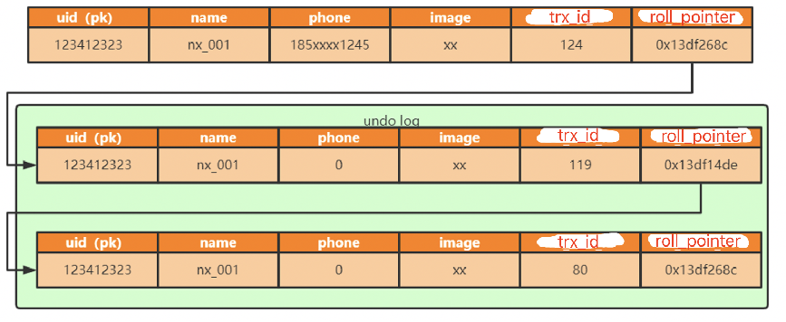 在行格式中,隐藏列有一个回滚指针(roll_point),指向undo日志: