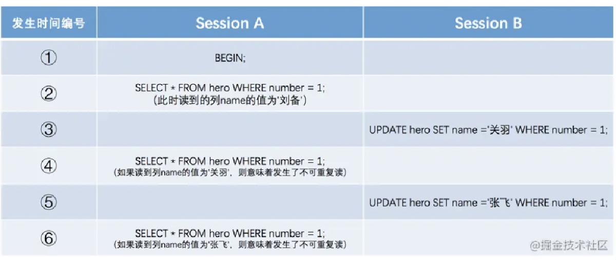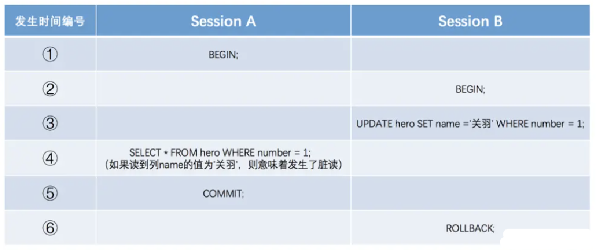 Session A和Session B各开启了一个事务,Session B中的事务先将number列为1的记录的name列更新为'关羽',然后Session A中的事务再去查询这条number为1的记录,如果读到列name的值为'关羽',而Session B中的事务稍后进行了回滚,那么Session A中的事务相当于读到了一个不存在的数据。