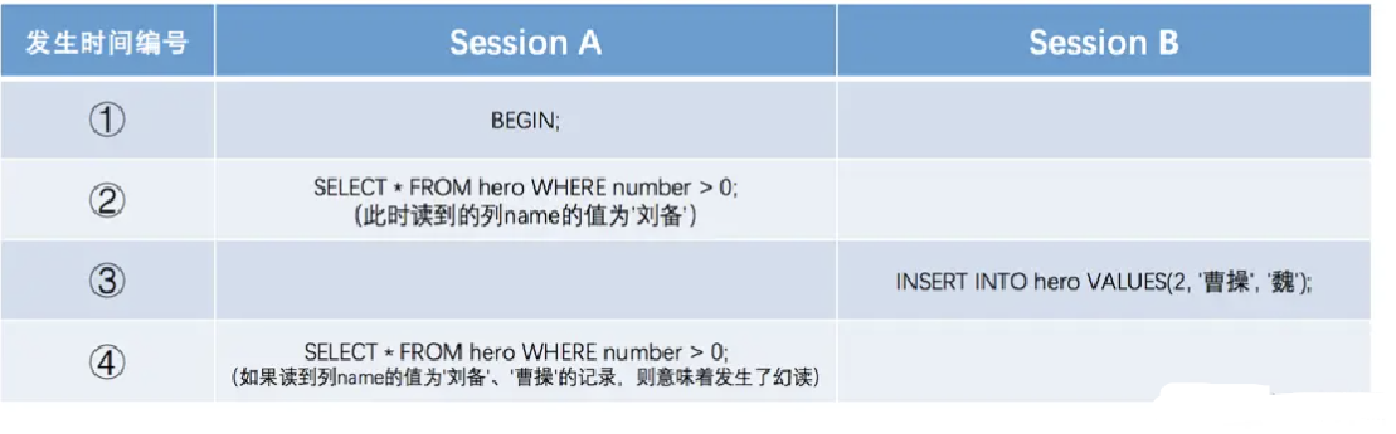 Session A中的事务先根据条件number > 0这个条件查询表hero,得到了name列值为'刘备'的记录;之后Session B中提交了一个隐式事务,该事务向表hero中插入了一条新记录;之后Session A中的事务再根据相同的条件number > 0查询表hero,得到的结果集中包含Session B中的事务新插入的那条记录。