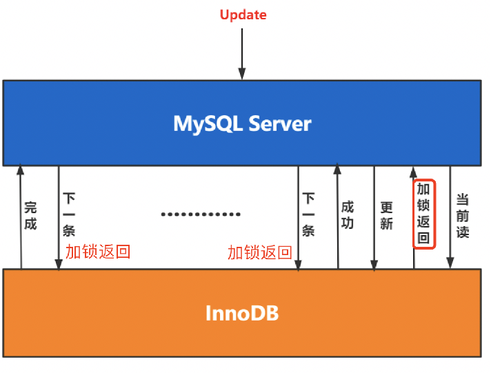 从图中可知,Mysql Server与InnoDB是一条条数据交互的,修改前需要先读(这里不是指select,而是mysql根据合适的索引读取到需要修改的数据),读的时候加锁,并且锁是一条条加的。