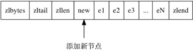 2.将一个长度大于等于 254 字节的新节点 new 设置为压缩列表的表头节点, 那么 new 将成为 e1 的前置节点