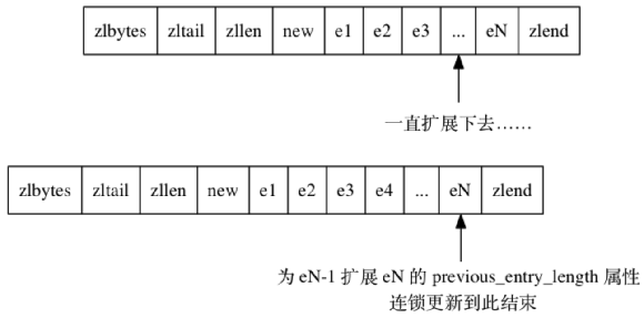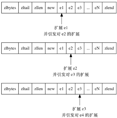 e1 的 previous_entry_length 属性需要从原来的 1 字节长扩展为 5 字节长。