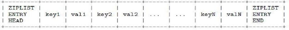 使用ziplist时的存储结构:K占一个entry,V也占一个entry,如下图: