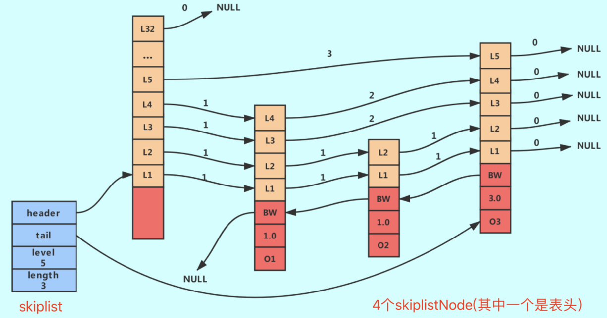 skiplist:跳跃表,一种有序的数据结构,通过在每个节点中维护多个指向其他节点的指针,从而能快速访问。