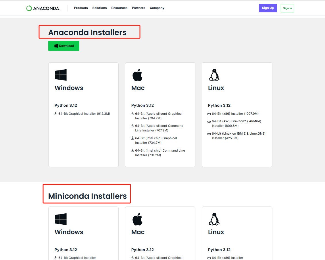 下载安装:有2个版本Anaconda Installers和Miniconda Installers,可以选择mini版本。