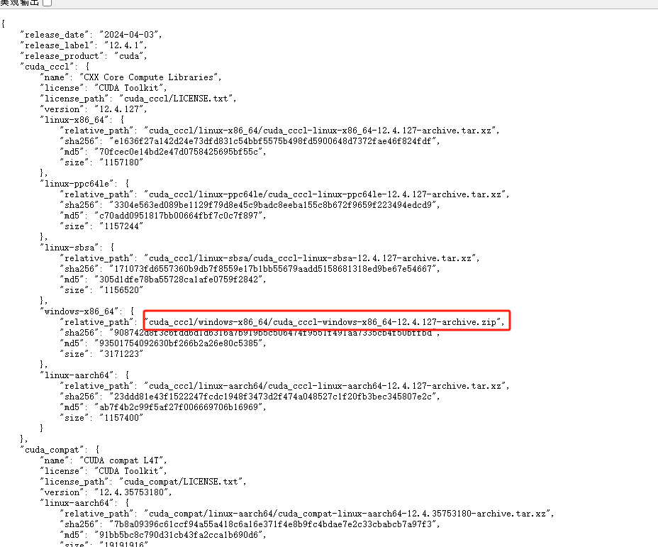 查看对就版本的发布文件:https://developer.download.nvidia.cn/compute/cuda/redist/redistrib_12.4.1.json