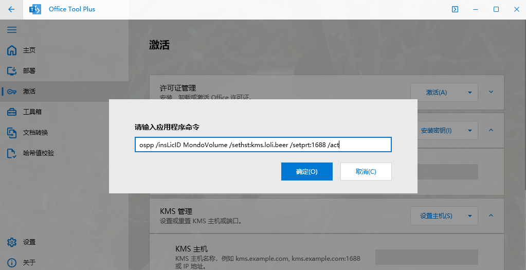 将ospp /insLicID MondoVolume /sethst:kms.loli.beer /setprt:1688 /act 复制入框中