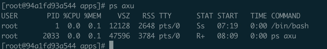 root 1 0.0 0.1 12128 2680 pts/0 Ss 07:41 0:00 /bin/bash