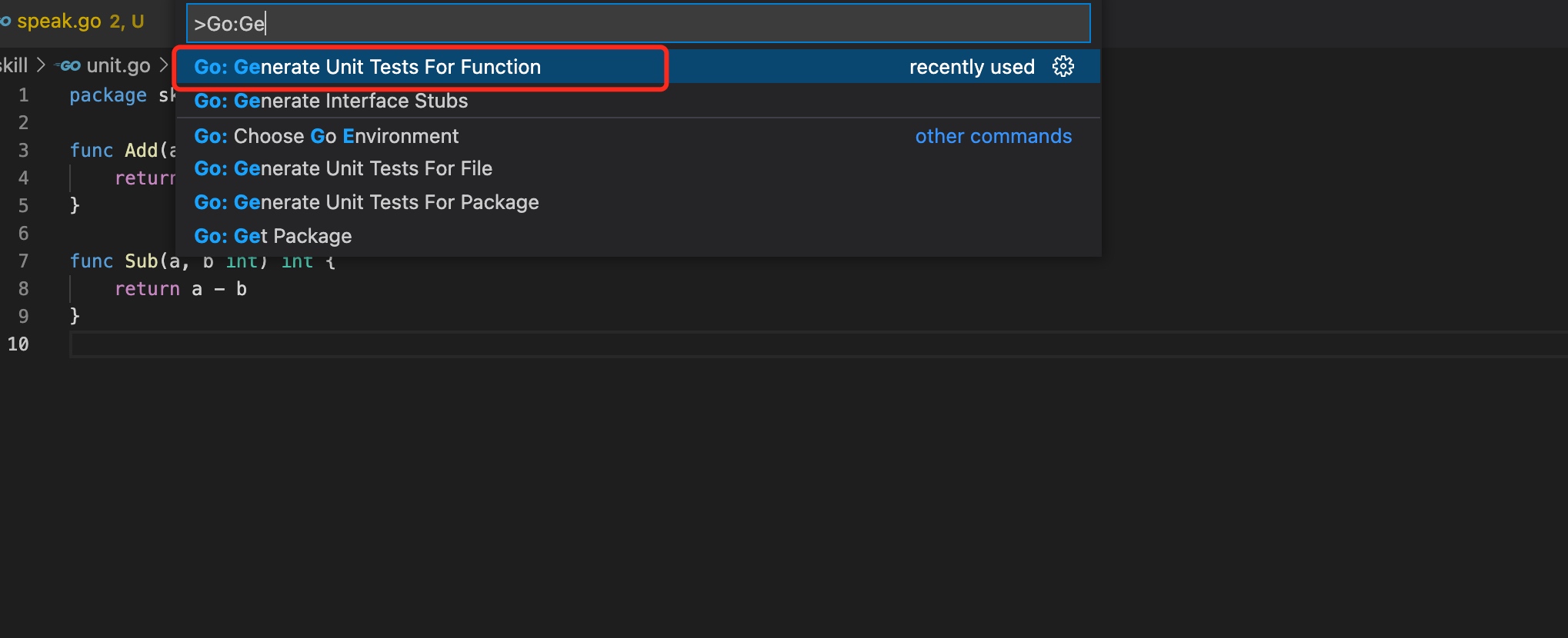 步骤3.快捷键 Ctrl+Shift+P,选择 Go:Generate Unit Tests For Functions